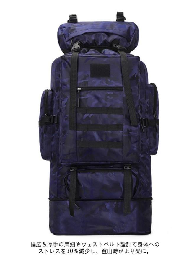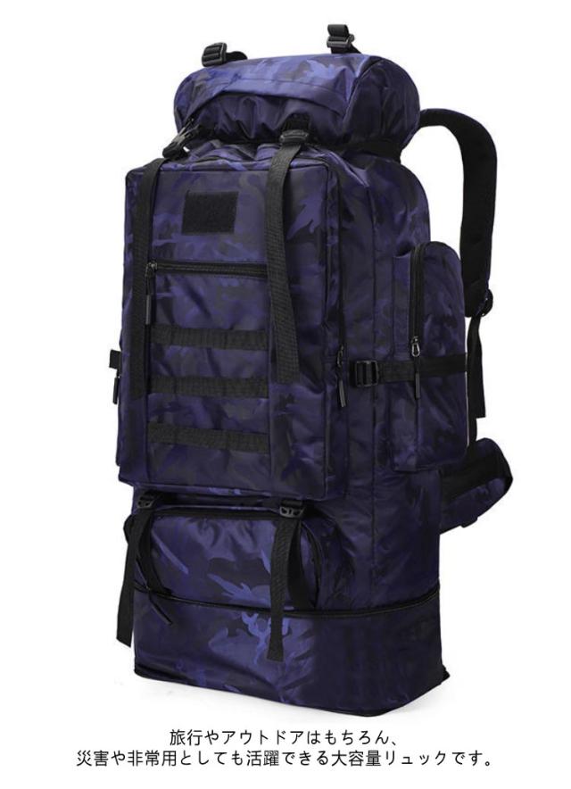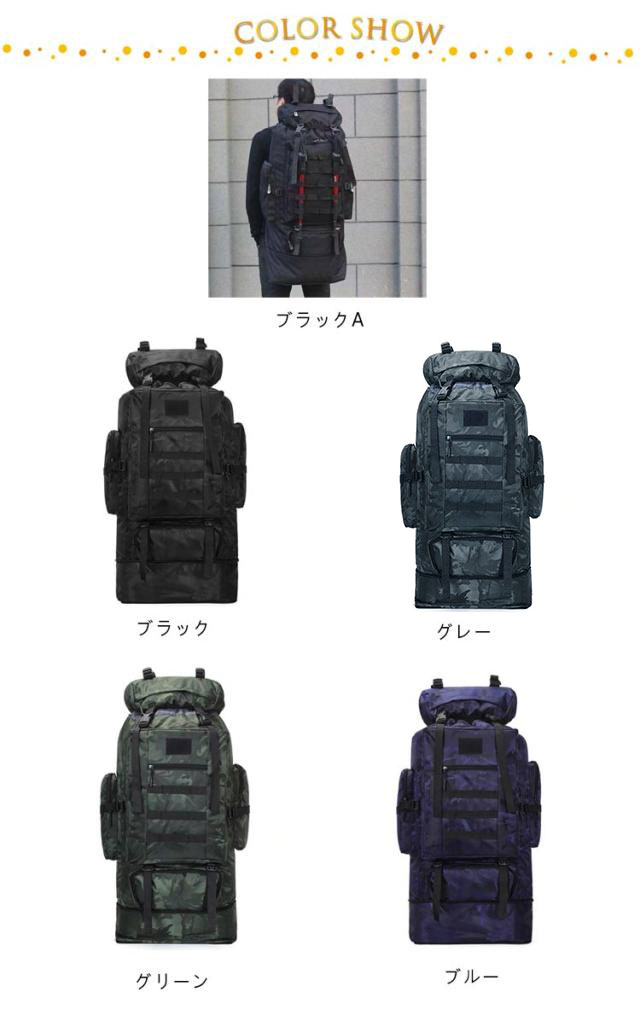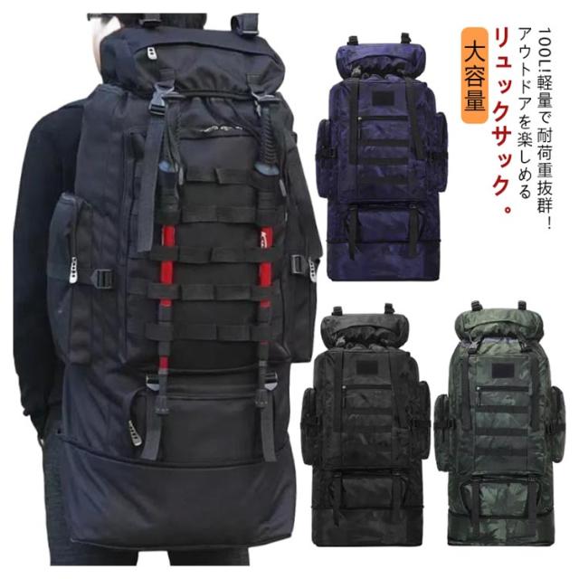 | 100L!軽量で耐荷重抜群!アウトドアを楽しめるリュックサック。 引き裂き防止と撥水のあるナイロン生地を採用するので、雨でも安心使用できます。 引き裂き防止機能があって、野外でもリュックが擦りむけられることが心配無用です。リュックが長持ちできます。 幅広&厚手の肩紐やウェストベルト設計で身体へのストレスを30%減少し、登山時がより楽に。 旅行やアウトドアはもちろん、災害や非常用としても活躍できる大容量リュックです。 | |