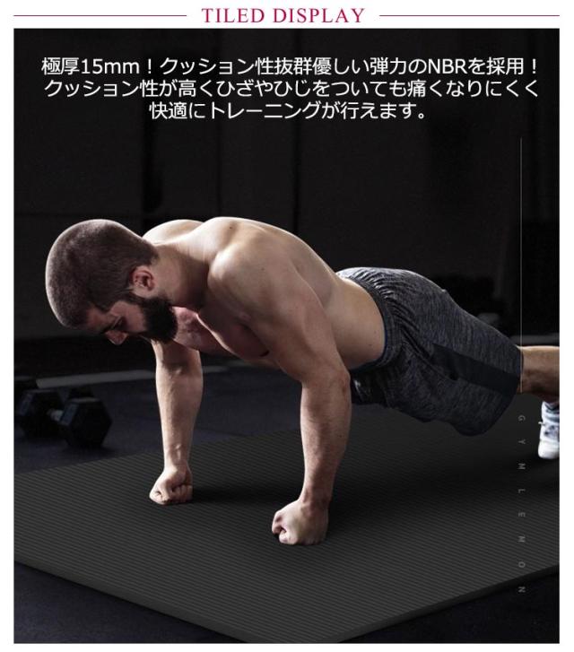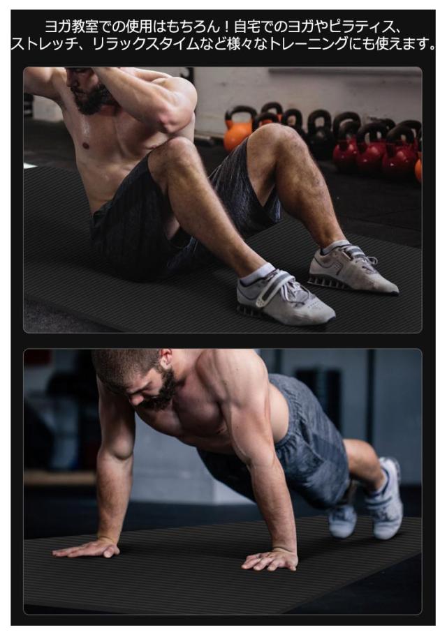 | 幅広(200cm*90cm)で極厚(15mm)のヨガマット!持ち運びに便利な【収納ケース&ゴムバンド付き】! 極厚15mm!クッション性抜群優しい弾力のNBRを採用!クッション性が高くひざやひじをついても痛くなりにくく快適にトレーニングが行えます。 汗や水分が染み込みにくい素材で濡れてもさっと拭けて清潔に使えます。 エンボス加工を施し表面が凸凹しているので、手足に張り付きにくくさらりとした使用感です。 約200cm×90cmのゆったりサイズなので様々なヨガのポーズや寝転がってのトレーニングにも対応! 厚みのあるマットによって床の保護や騒音を軽減してくれます。 持ち運びに便利な収納ケース&ゴムバンド付き!収納ケースとゴムバンドがセットなのでヨガ教室にも持ち運び楽々!また軽量なので手軽に持ち出せます。 ヨガ教室での使用はもちろん!自宅でのヨガやピラティス、ストレッチ、リラックスタイムなど様々なトレーニングにも使えます。 | |