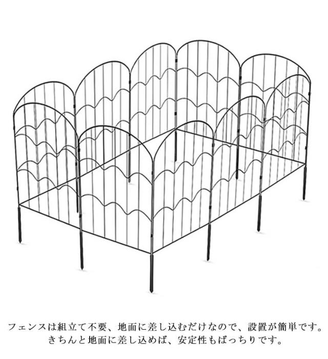 | 華やかで高級感のあるアイアンフェンス10枚セットです。【35*60cm】×10枚 見通しのいいアイアンフェンスは、お庭をすっきり広く見せますし、よりおしゃれに飾れます。 【耐久性に優れる】頑丈なアイアン製品、木製のものより経年劣化が少なです。防錆処理を施しているので、錆に強く、長くお使いいただけます。 【自由にアレンジ】ジョイントで連結式なので、お庭のサイズや形に合わせて何枚でも連結可能です。コの字やLの字型など、スペースに合わせて置き方は自由自在です。 【設置簡単】フェンスは組立て不要、地面に差し込むだけなので、設置が簡単です。きちんと地面に差し込めば、安定性もばっちりです。 【様々な用途】花壇やお庭、家庭菜園などのフェンス、仕切りとして使ったり、中小型犬のドックランフェンスとして使ったり、つる性の植物を絡ませてトレリスとしてもお使いいただけます。 | |