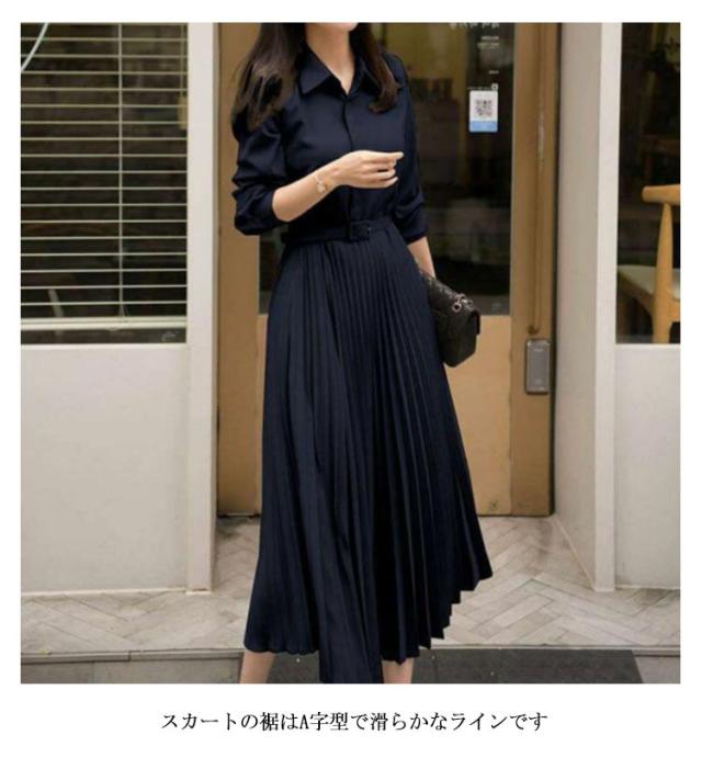 長袖 ワンピース プリーツ プリーツワンピース レディース 春 夏 秋 冬 ロング マキシ ロングワンピース マキシワンピース シャーリング きれいめ ウエストベルト付き