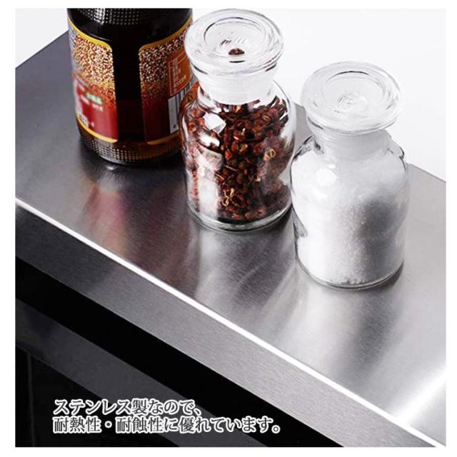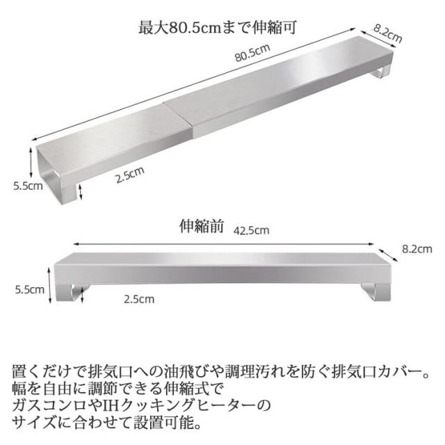 | ステンレス製伸縮式排気口カバー 収納しながら、汚れを防ぐ。 42.5cm~80.5cm伸縮可能 置くだけで排気口への油飛びや調理汚れを防ぐ排気口カバー。 幅を自由に調節できる伸縮式でガスコンロやIHクッキングヒーターのサイズに合わせて設置可能。 約6.7cmの高さで圧迫感を軽減し、フロントバッフルプレートのデザインは油の飛散を効果的に防ぎ、排気口を保護します。 ステンレス製なので、耐熱性・耐蝕性に優れています。 フラットタイプだから調味料や調理中の鍋、フライパンの一時置きにも。 カバーはサッと拭いてお手入れも簡単です。 予防掃除できるだけでなく、重たいものでも置ける耐久性と奥行きを伸ばすことによって大きなものも置けるラック型の排気ロカバー。 | |