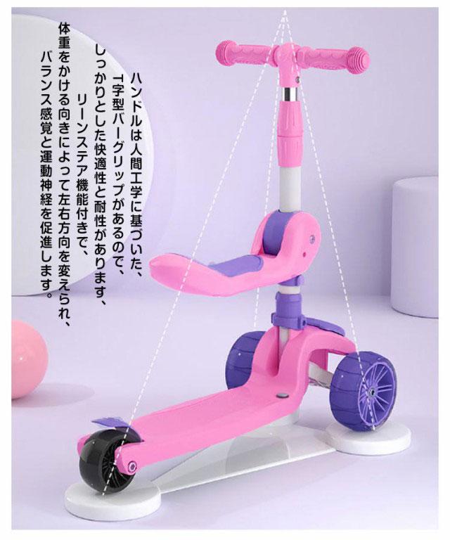 | 子供向けの座って乗れるキックボード 子供の身長により、67cm、71cm、75cm、79cmの4段階に調節できます。 走るときにピカピカ光るホイールを使用し、夜間でも目立つから万が一のときも目に入りやすくなっています。 後輪についているフットブレーキを片足で軽く踏むことで、スピードを簡単に調節でき、安全性とオシャレを両方も実現します。 ハンドルは人間工学に基づいた、T字型バーグリップがあるので、しっかりとした快適性と耐性があります、リーンステア機能付きで、体重をかける向きによって左右方向を変えられ、バランス感覚と運動神経を促進します。 場所を取らなくてコンパクトなので、玄関などの室内保管や車のトランクに置いても問題ないです。 シートの設計で、子供たちはペダルの上に座ることができます。 | |