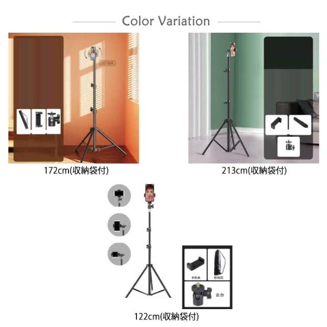 | 122cm/172cm/213cm スマホ三脚 収納袋付 角度自由自在!ホルダー部の首を360度回転させると自由なアングルで撮影が可能です。 収納袋付!折りたためるので、付属の収納袋に入れてコンパクトに持ち運ぶことが可能です。 軽量かつ丈夫な合金鋼を採用。抜群の安定性でブレない映像撮影を可能にしています。 マイクやライトなどのアクセサリーの取り付けが可能です。 【使用シーン】 集合写真や記念撮影時、運動会、撮影会、ライブ、コンサート、ピアノの発表会、ホームパーティーなど様々なシーンでお使い頂けます。 また、SNS/TikTok/YouTube生放送/zoom/vlog webカメラ ライブ配信 自撮り ビデオ 動画撮影はこれ1本でOK。 サイズは122cm/172cm/213cmの3サイズを選択可能。 詳細のサイズは下記となります。 ■122cmサイズ 最長 約122cm 収納時 約44cm ■172cmサイズ 最長 約170cm 収納時 約54cm ■213cmサイズ 最長 約210cm 収納時 約70cm ※高さ調節ネジを回すことでお好みの高さを調節することが可能です。 | |