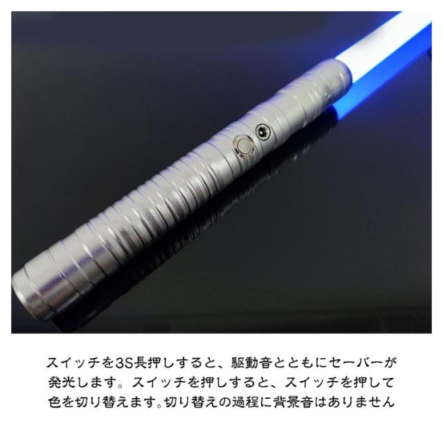 | 【充電式リチウムバッテリーを搭載】充電時間: 約3-4時間。充電用ケーブルをLEDライトセーバーのポートに差し込みますと充電を開始します。※充電中のご使用はできません。 【14色+交互のグラデーション】ボタンを押すごとに14色に光る、カラーバリエーションを楽しめます。電源ボタンを押すごとに色が切り替わり、全15種類のパターンを楽しめます。(14色+交互のグラデーション) 【3つの効果音】サウンドモード:スイッチを短押しすると、駆動音とともにセーバーが発光し、待機音が流れます。スイッチを押しすると、スイッチを押して14色の切り替えと背景音が伴います。衝撃に合わせ、衝撃音が鳴り響きます。 【ミュートモード】スイッチを3S長押しすると、駆動音とともにセーバーが発光します。スイッチを押しすると、スイッチを押して色を切り替えます。切り替えの過程に背景音はありません。 | |