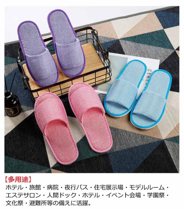 | 5色展開の個包装された綿麻地使い捨てスリッパ。】【50足セット】 【天然素材&防菌防臭】本体:綿麻 底面:EVA。べたつかず素足で気持ち良く履いていただけます。通気性良くて、防菌防臭、全体的に足の輪郭と合わせます。実用性とデザインに優れた柔らかいスリッパです。 【洗濯でき、個包装】 汚れても簡単に洗えて繰り返しの使用も可能。1足ずつ個包装されているため衛生面でも安心して保管でき、持ち運びにも便利、災害時や旅行などに役立ちます。 【多用途】ホテル・旅館・病院・夜行バス・住宅展示場・モデルルーム・エステサロン・人間ドック・ホテル・イベント会場・学園祭・文化祭・避難所等の備えに活躍。 | |