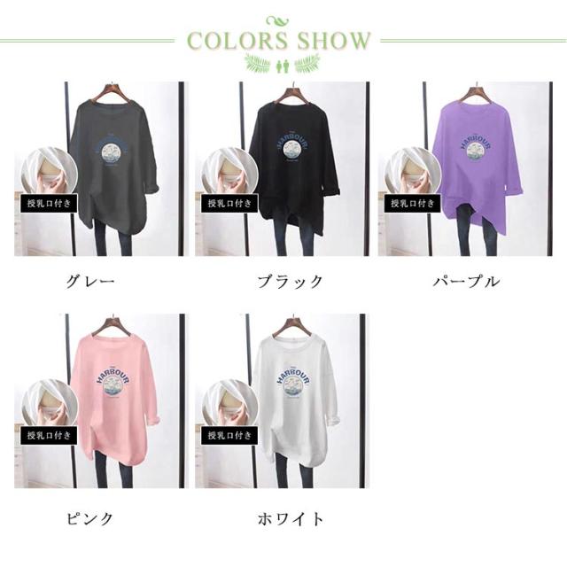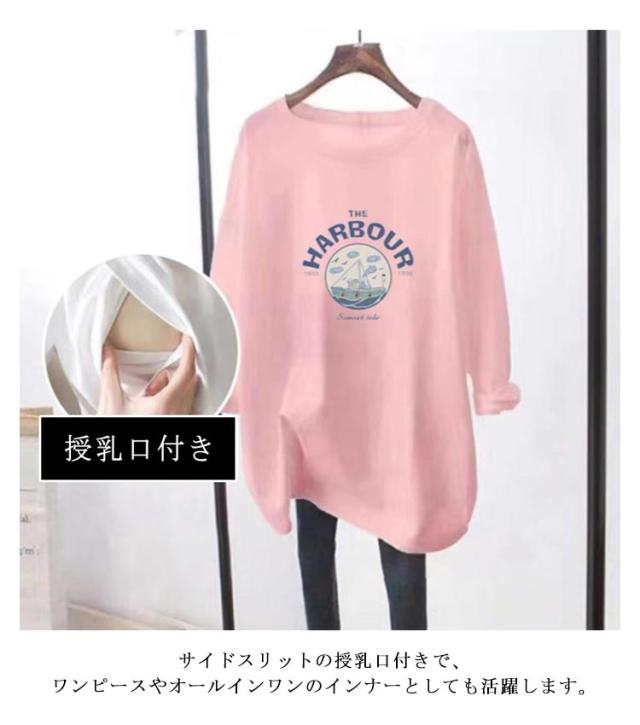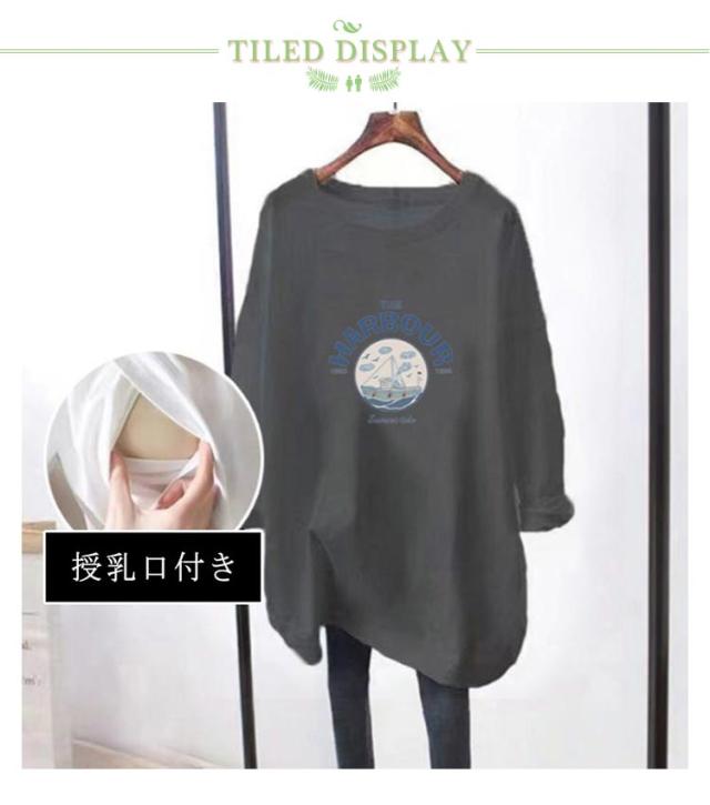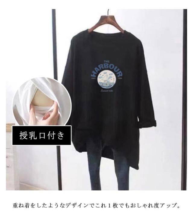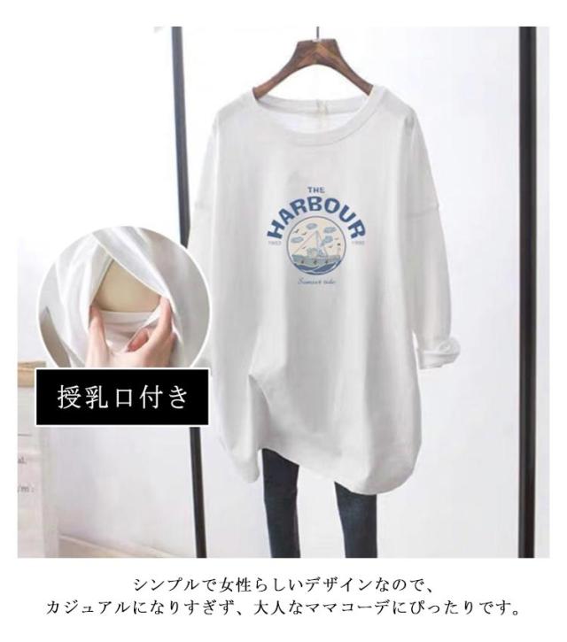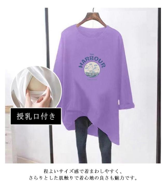 授乳口付き 長袖Tシャツ マタニティ トップス 授乳ウェア 春 トレーナー クルーネック ロゴTシャツ 授乳ウェア 可愛い ルームウェア シンプル 産前 産後兼用 妊婦
