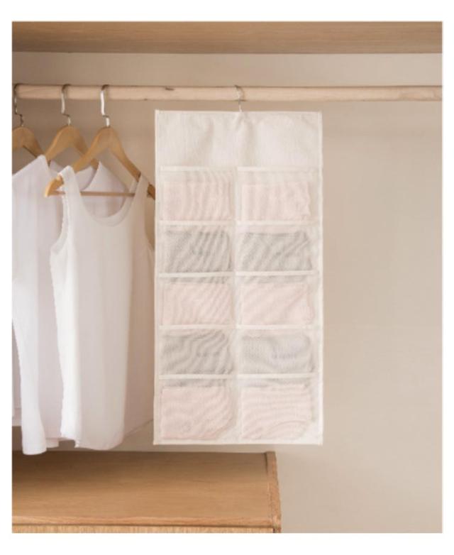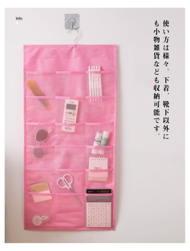| 2個セット!引き出しタイプの収納が苦手な方にオススメ。両面タイプのポケット付きの収納ラックです。 表5ポケット+裏10ポケットで合計20ポケット/表12ポケット+裏18ポケットで合計30ポケットついております。 ハンガータイプなので掛けて収納することで省スペースを実現。持ち運びも便利な軽量タイプ。 通気性のよいメッシュ対応で、水洗いすることも可能です。 使い方は様々。下着、靴下以外にも小物雑貨なども収納可能です。 | |