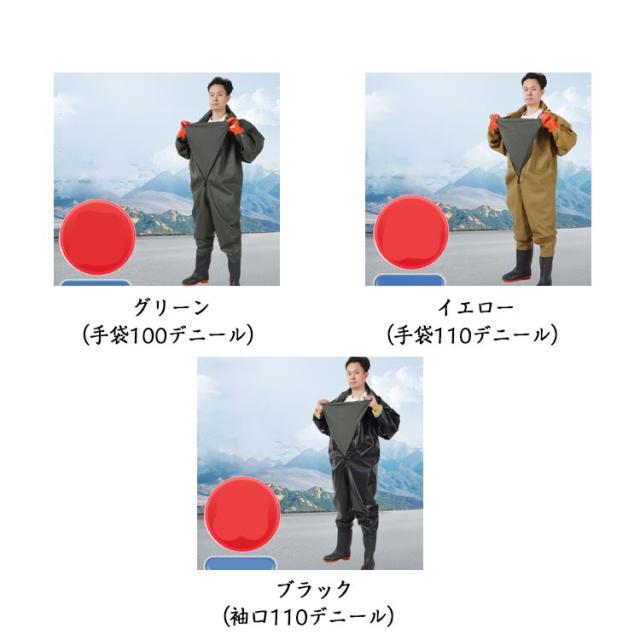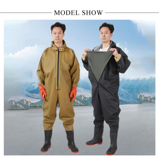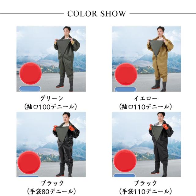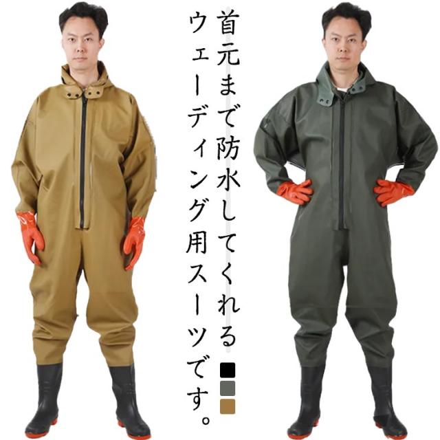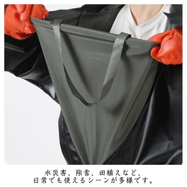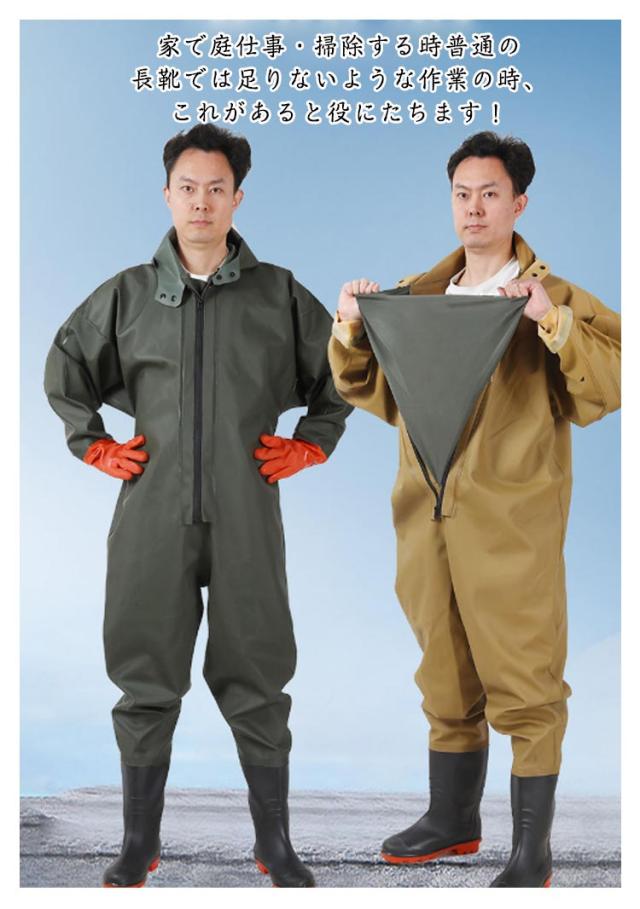 | 首元まで防水してくれるウェーディング用スーツです。全身防水!袖口タイプと手袋タイプ!胸ファスナーの後ろに防水シートがついて、二重防水効果があり、快適に水の中で働きます。通常のウェーダーではカバーすることの出来ないところでも、水の浸入を気にすることなくご使用いただけます。 高弾力性のある新しい環境に良い生地を採用して、外層材質はPVCを採用し、高い耐水性のほか、油汚れや酸・アルカリにも強いです。 耐久性のあるPVCブーツは、ラジアルソールタイプの鞋底を備わており、渓流、小池、泥沼などの中に渉っても安定的です。良い耐久性、耐摩耗性により、使用寿命は延ばします。水災害、除雪、田植えなど、日常でも使えるシーンが多様です。 アウトドアでの渓流釣や河口での川釣り・水仕事・農作業・畑仕事・漁業・水産業・除雪作業・冠水時など、あらゆる場面で野外活動をサポートします。家で庭仕事・掃除する時普通の長靴では足りないような作業の時、これがあると役にたちます!防災・災害用備品として、ご家庭だけでなく、職場やお店などにもあると安心です。 | |