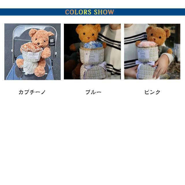 | 【可愛いクマ+花束】【3colors】【28cm/40cm】 温かい気持ちが伝わる花。手入れが不要で、枯れない、花粉症の心配なし。 ソープフラワーがボリュームがあり、見栄えが良い。SNS映え間違いなし! 結婚祝い ・ 誕生日祝い ・出産祝い・還暦祝い・退職祝い ・発表会・記念日等のプレゼントとしておすすめです。 | |