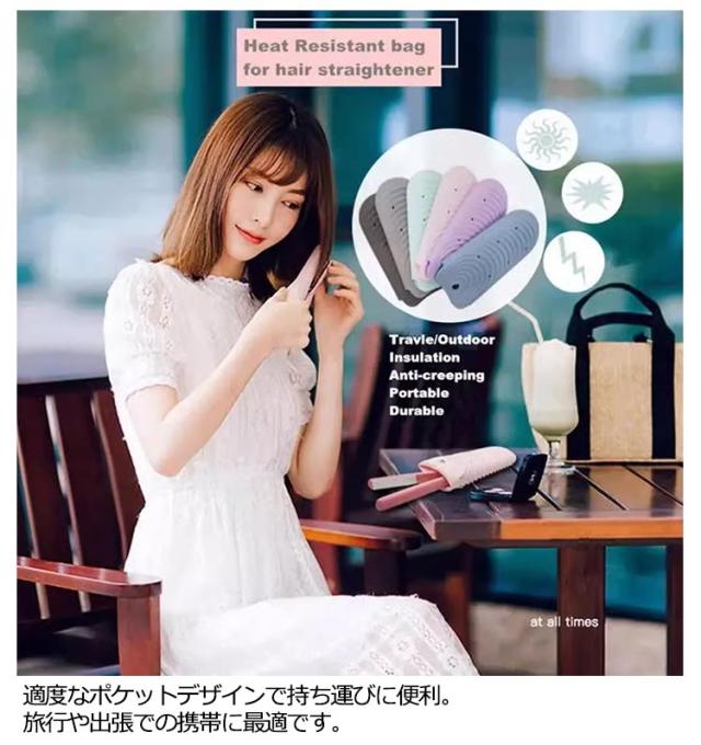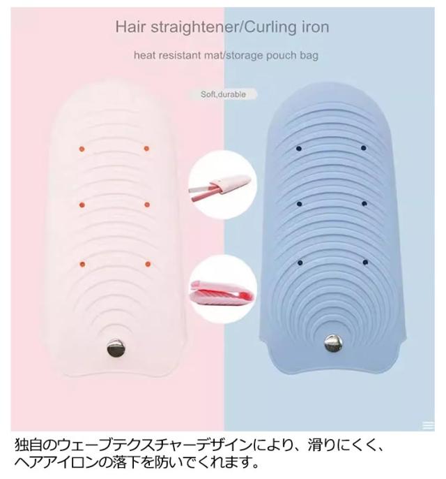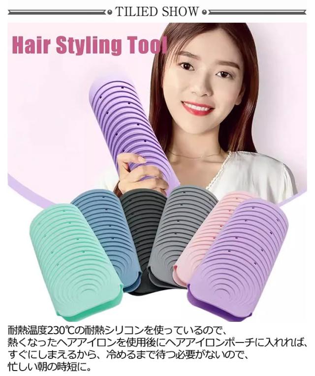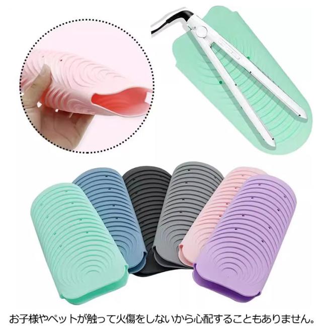 | 熱いまま収納ok♪シリコン製ヘアアイロン耐熱ポーチ。 耐熱温度230℃の耐熱シリコンを使っているので、熱くなったヘアアイロンを使用後にヘアアイロンポーチに入れれば、すぐにしまえるから、冷めるまで待つ必要がないので、忙しい朝の時短に。 お子様やペットが触って火傷をしないから心配することもありません。 適度なポケットデザインで持ち運びに便利。旅行や出張での携帯に最適です。 独自のウェーブテクスチャーデザインにより、滑りにくく、ヘアアイロンの落下を防いでくれます。 シリコン製なので水で簡単に洗えるから、いつも清潔に。ポールや温泉など場所への持ち運びも安心。 | |