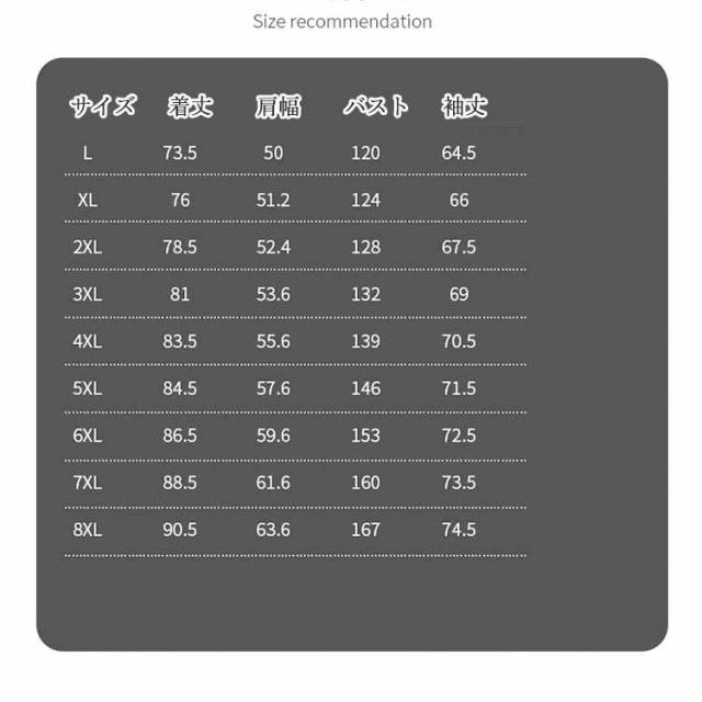 | サイズ | L XL 2XL 3XL 4XL 5XL 6XL 7XL 8XL |