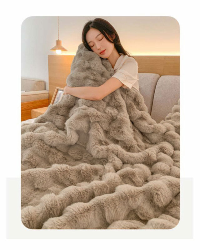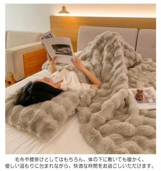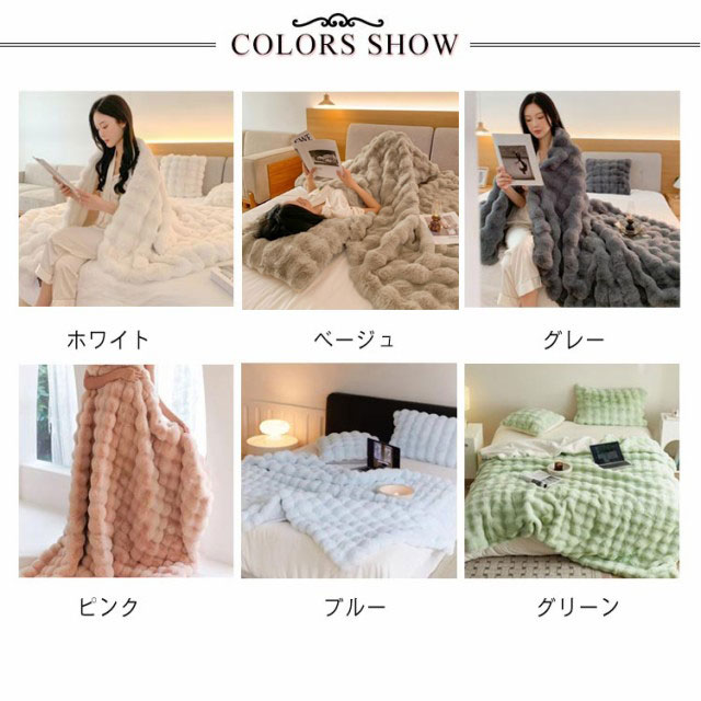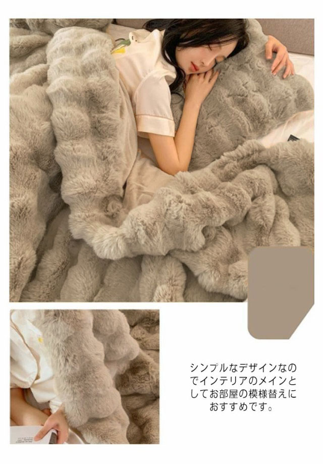 | 高級感・触り心地最高のラビットファー調ブランケット。 リアルファーのような高級感といつまでも触れていたいなめらかな肌ざわりが魅力。 A面は長毛、B面は短毛で、両面を合わせたデザインと断熱素材なので冷たい風をカットし暖かさが長続きします。 大量の毛を丁寧に縫い込んでいますので、毎日使っても毛抜けしにくいです! 静電気の発生を抑制する加工を施しており、冬場のストレスや不調などを大幅に軽減します。 毛布や膝掛けとしてはもちろん、体の下に敷いても暖かく、優しい温もりに包まれながら、快適な時間をお過ごしいただけます。 ご家庭の洗濯機で洗える、優しい肌ざわりのあったか毛布です。 またお部屋の雰囲気に合わせて6colorご用意致しました♪ シンプルなデザインなのでインテリアのメインとしてお部屋の模様替えにおすすめです。 | |