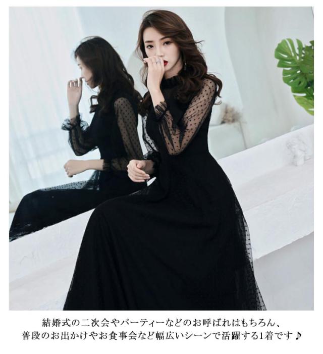 パーティードレス ロングドレス 袖あり 結婚式 お呼ばれ ワンピース 長袖 シースルー 透け感 ドット柄 フリルネック 立ち襟 スタンドカラー マキシ丈 ブラック フォーマル 大人 上品 二次会 演奏会