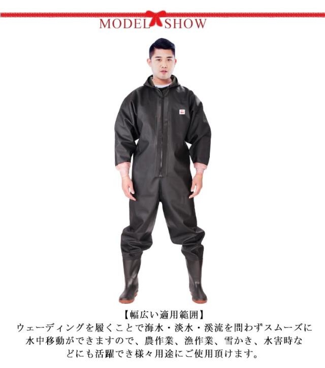 | 【幅広い適用範囲】ウェーディングを履くことで海水・淡水・溪流を問わずスムーズに水中移動ができますので、農作業、漁作業、雪かき、水害時などにも活躍でき様々用途にご使用頂けます。 【更新された伝統工芸】全体の繋ぎ目は伝統の加熱プレスからシームレス溶接加工に更新されて、より滑らかで堅固となり、防水性も高くなります。 【防水性・保温性高い素材】撥水性に優れたPVC素材を使用されて、厚めの生地なので、保温性がよくて、柔らかくて汗を吸います。 【動きやすいデザイン】本商品の股下を大きくとり、足回りも太めに設計しており、楽に上がり下がりできます。 | |