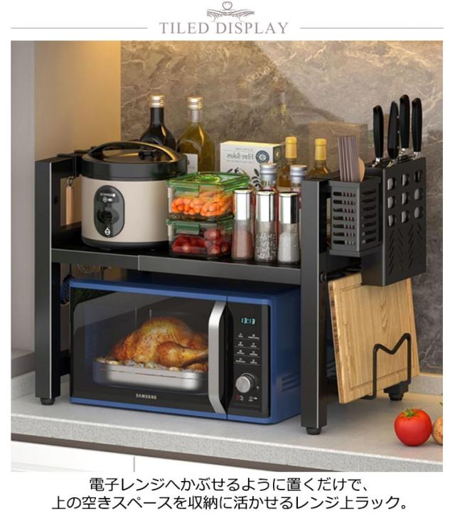 | プレゼント7点 横伸縮可能 2段階 電子レンジへかぶせるように置くだけで、上の空きスペースを収納に活かせるレンジ上ラック。 こちらのラックを使えば、上部のスペースを有効活用することができます。 耐荷重は約75kgなので、キッチン家電や小物、調味料など置ける丈夫さ。 幅は約40〜63cmの間で伸縮でき、レンジの大きさやスペースに合わせて幅を調節できます。 棚の高さは2段階調節ができるます。棚下の高さは最大で(約)43cmにでき大型レンジや背の高い調理器具などを収納することができます。 フレームはスチール製で安定感があります。 サイドにフックが付いて、お玉などのキッチンツールなどを掛けるのに便利 シンプルなデザインだから圧迫感がありません。 | |