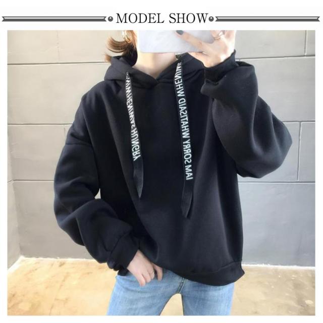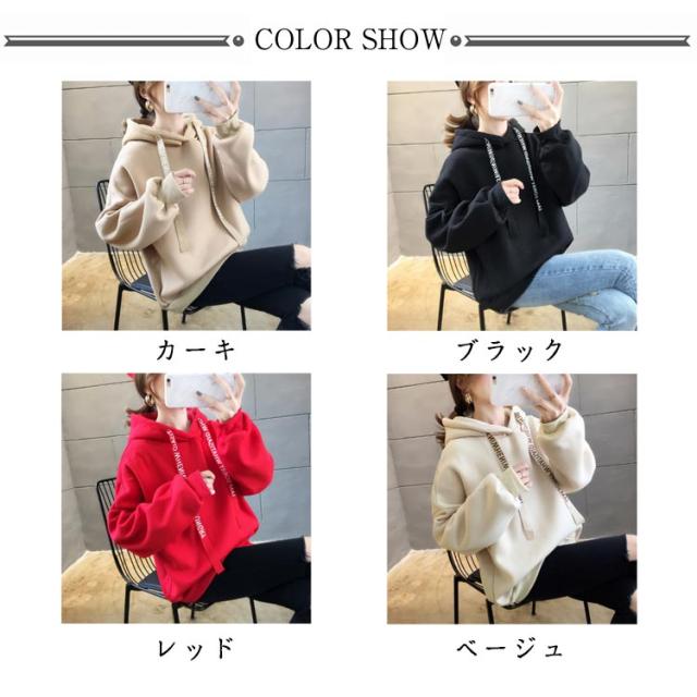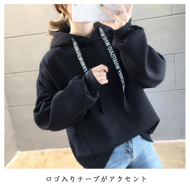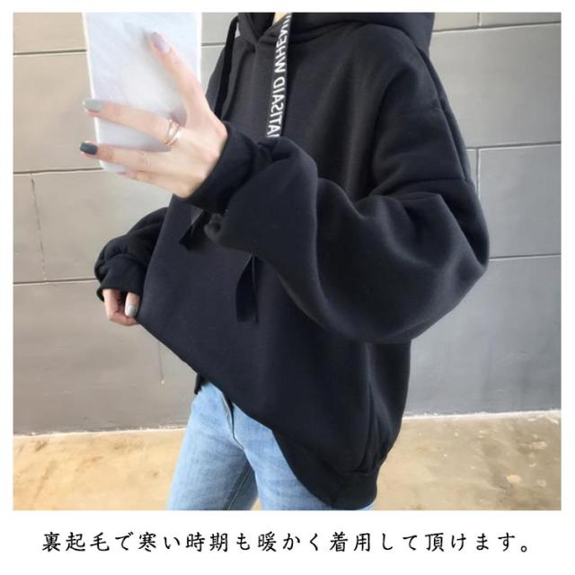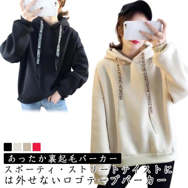 パーカー レディース 裏起毛 長袖 フード付き ロゴテープ トレーナー スウェット プルオーバー フーディ 厚手 暖か トップス あったか 保温 カジュアル 春 秋 冬