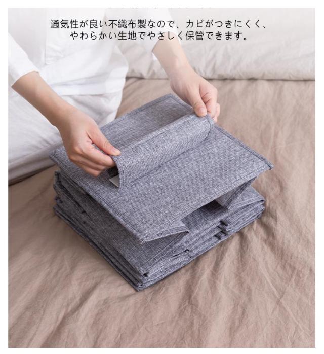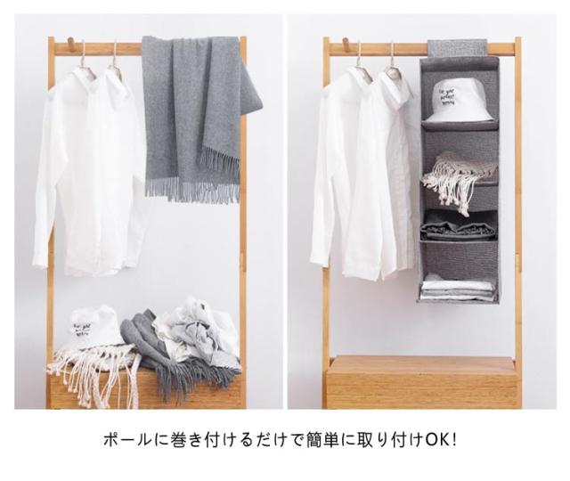 | 吊り下げ収納ラック。 クローゼットやハンガーラックのポールに吊るすだけで簡単にタテ置き収納の棚が設置できます。 棚置き式で、出し入れが簡単にでき、シャツやセーター、帽子などの気になる型くずれを防いで収納できます。 ポールに巻き付けるだけで簡単に取り付けOK! 通気性が良い不織布製なので、カビがつきにくく、やわらかい生地でやさしく保管できます。 使わない時は、折りたたんでおけば、かさばらすに省スペースで保管ができます。 | |