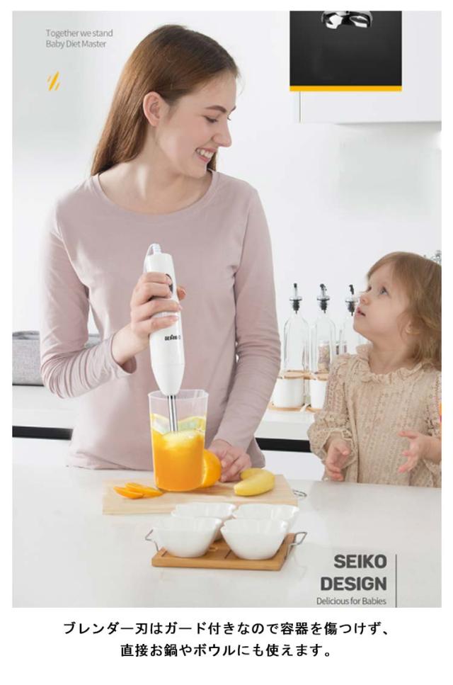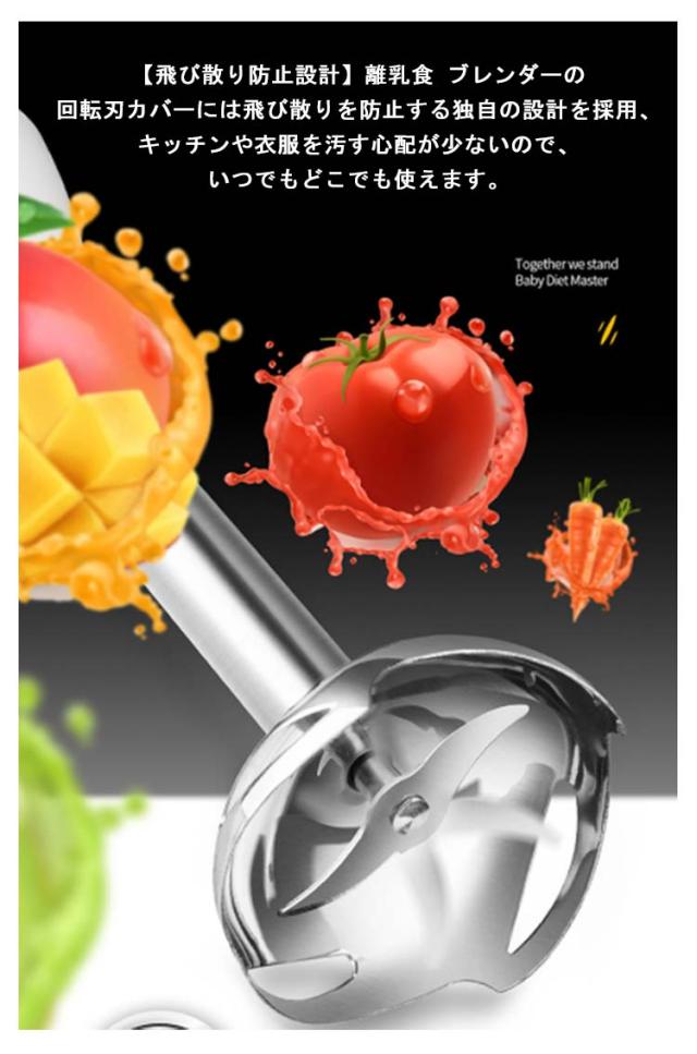 | 【飛び散り防止設計】離乳食 ブレンダーの回転刃カバーには飛び散りを防止する独自の設計を採用、キッチンや衣服を汚す心配が少ないので、いつでもどこでも使えます。ブレンダー刃はガード付きなので容器を傷つけず、直接お鍋やボウルにも使えます。 【使いやすい&省スペースで収納】「ボタンを押す!」という簡単な操作でアタッチメントの交換が可能です。 マルチスティックブレンダーは壁掛けハンドルなので収納しやすいです。モーター以外の容器、カッターと蓋は丸洗いできて、いつも清潔な状態を保つことができます。 | |