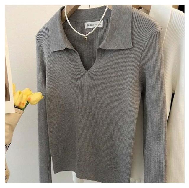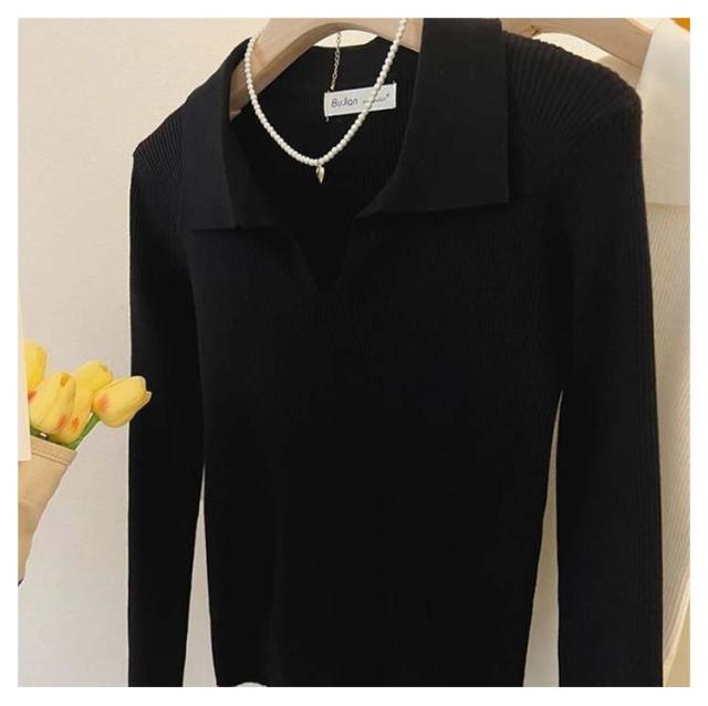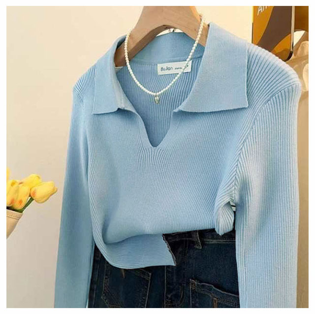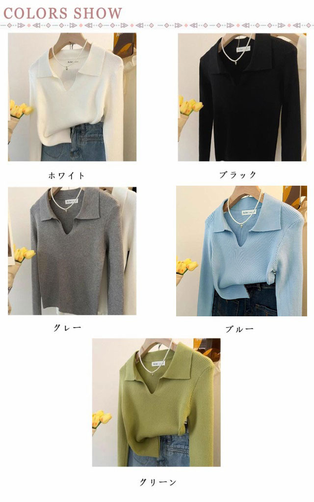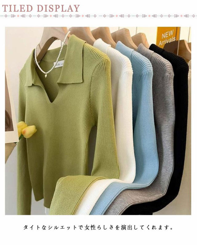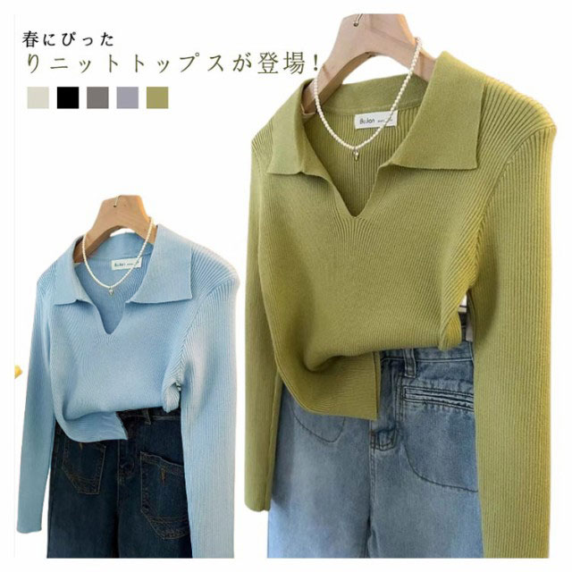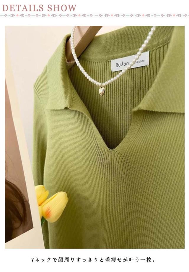 ニット Vネック 春 レディース 長袖 リブ ニットソー シンプル スリム フィット ポロニット 通勤 細身 きれいめ カジュアル オフィス 韓国ファッション おしゃれ