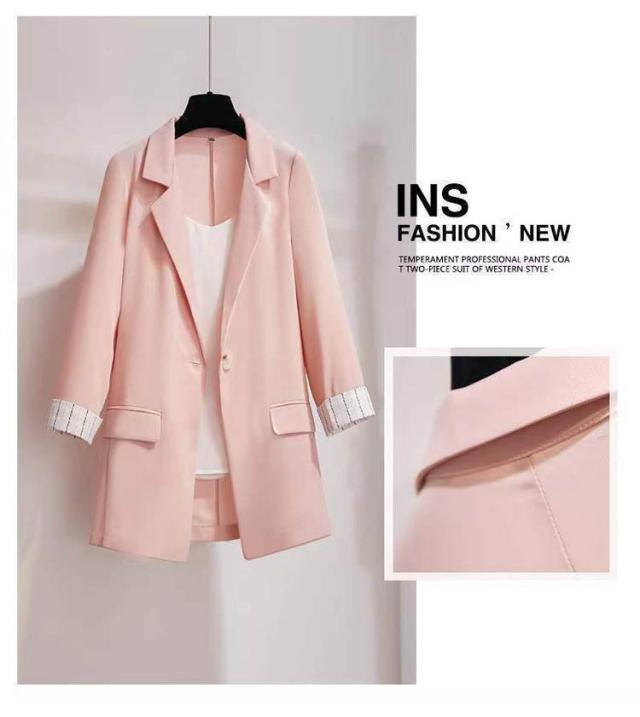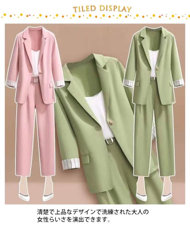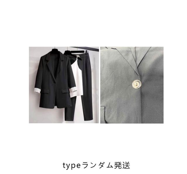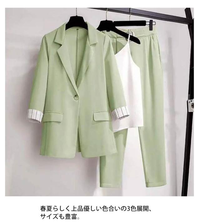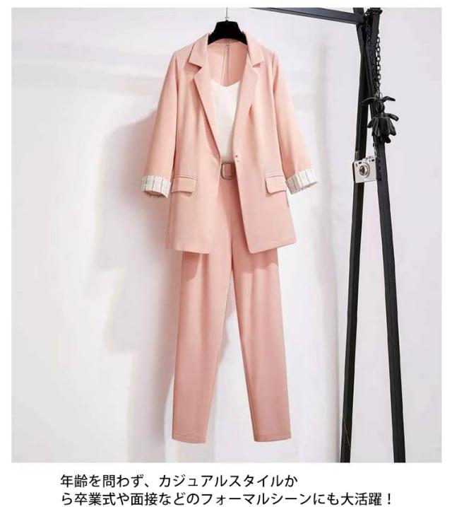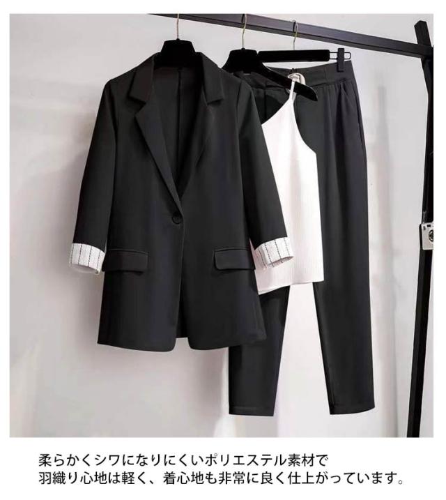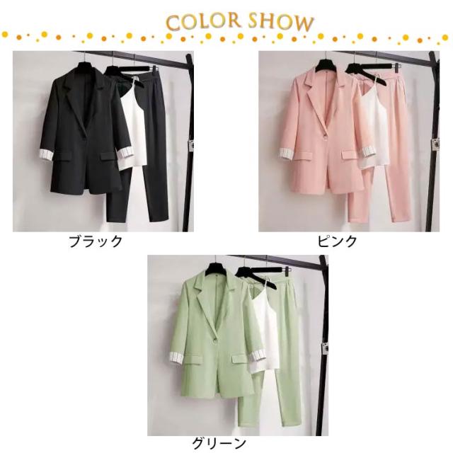 セットアップ レディース パンツスーツ 春夏 通勤 スーツ 3点セット 上下セット 七分袖 ジャケット キャミソール付き ズボン 通勤 スーツ 大きサイズ ビジネススーツ オシャレ カジュアルスーツ エレガント キレイめ 韓国風 お洒落