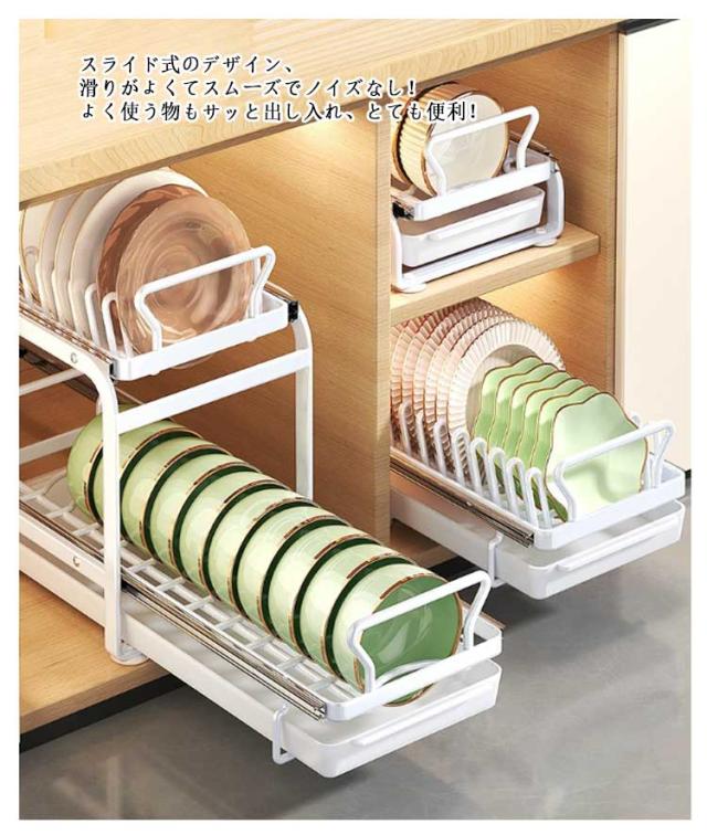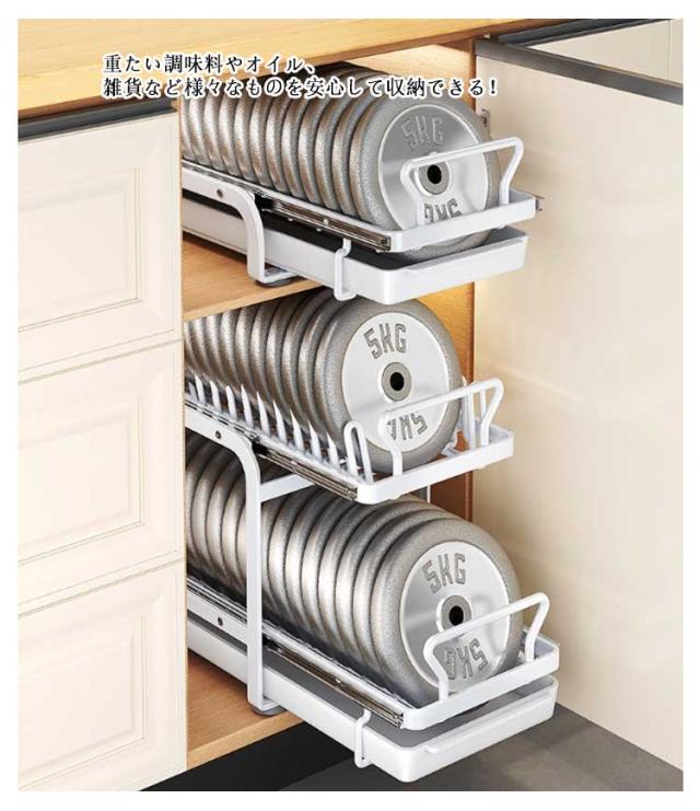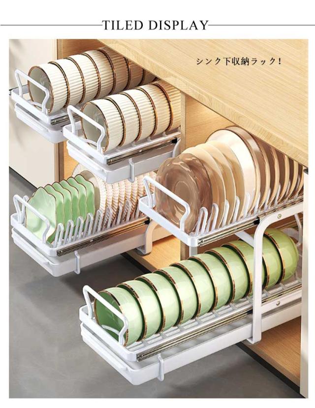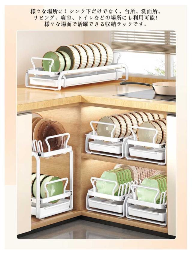 | シンク下収納ラック! 引き出し・スライド式!スライド式のデザイン、滑りがよくてスムーズでノイズなし!よく使う物もサッと出し入れ、とても便利! 重たい調味料やオイル、雑貨など様々なものを安心して収納できる! シンク下の収納を上品&お洒落に変えてくれる。 様々な場所に!シンク下だけでなく、台所、洗面所、リビング、寝室、トイレなどの場所にも利用可能!様々な場面で活躍できる収納ラックです。 | |