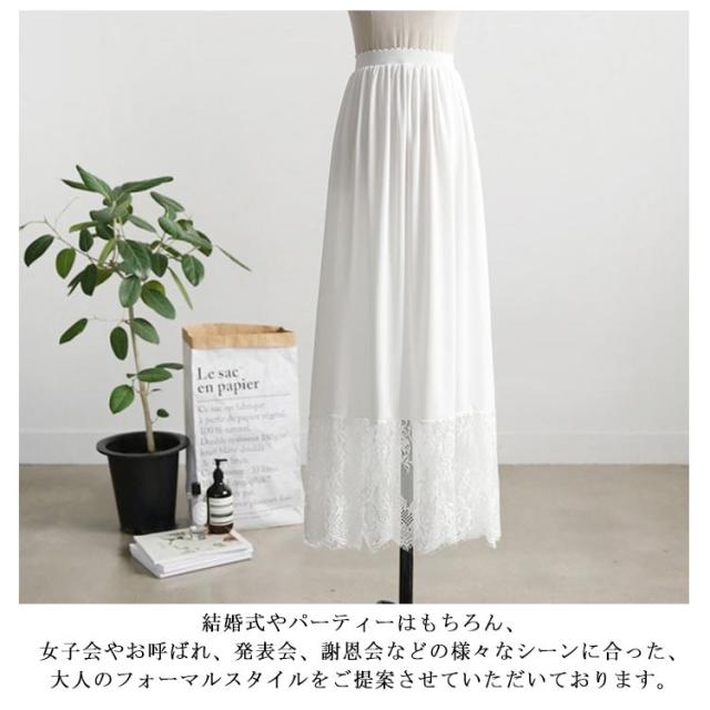| 繊細なレースを使用しており、コーディネートを上品にまとめてくれます。 着回しに活躍するマキシ丈レースペチコート さりげないアレンジで、周りとかぶらないコーデが出来るおススメアイテムです。 ウエストはゴム仕様なので着用しやすいのもうれしいポイントです。 結婚式やパーティーはもちろん、女子会やお呼ばれ、発表会、謝恩会などの様々なシーンに合った、大人のフォーマルスタイルをご提案させていただいております。 | |