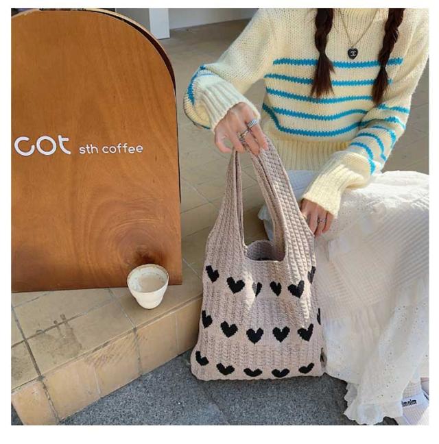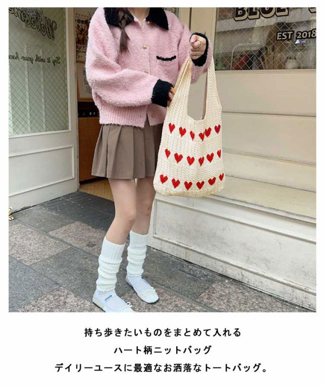 ニットバッグ トートバッグ レディース ハート トート ニットトート エコバッグ ハート柄 ニット生地 A4サイズ 収納可能 かばん 鞄 軽量 肩掛けカバン 通勤 通学 日常 ディリー 普段使い 通学 買い物 シンプル カジュアル ナチュラル おしゃれ