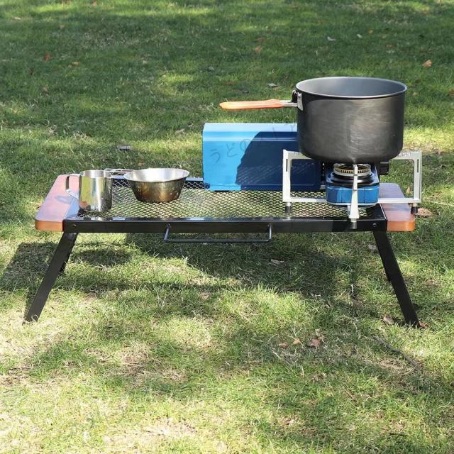 アイアン製 メッシュテーブル サイドテーブル 焼き台 耐熱型テーブル 五徳 調理台 ファミリーキャンプ メッシュラック 折り畳式 簡単設営 コンパクト 収納袋付き