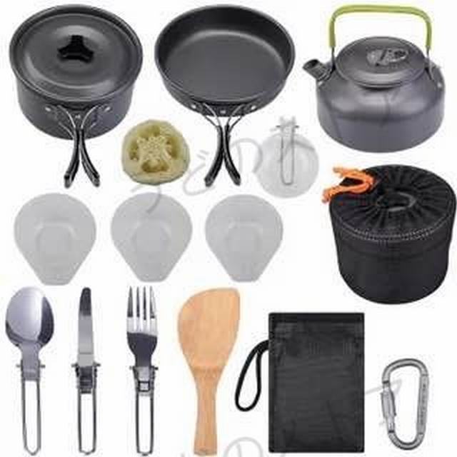 【製品の説明と仕様】材料:鍋セット本体/超軽い酸化アルミニウム ハンドル/アンゼン食品級のシリコンとステンレス重量:1050g 使用人数:2〜3人(推薦)鍋:17cm x 9cm フライパン:18cm x 4.5cm やかん:15cm x 8cm付属品:PP材お碗お碗x3 竹しゃもじx1 スポンジx1 ナイフ×1 フォーク×1 スプーン×1 Dリング×1 収納袋 ×1 【滑り止め 防熱設計】 防熱する為、プラスチック材で作って蓋とハンドルカバーは、偶発的なやけどを防がられます、鍋を加熱した状態でも、お気軽にご利用ください!【折りたたみできるハンドル 持ち運びが簡単】 ハンドルは折りたたみ時、13点のセットは一体に収納できます。收納バッグに入れて、非常に小さいサイズので、持ち運びがとても便利です。【高強度 高耐久】 ハードアノダイズド加工された鍋は表面硬度が高いので、耐摩耗性が高く、表面の傷や腐食等を避けることで永く使用できます。