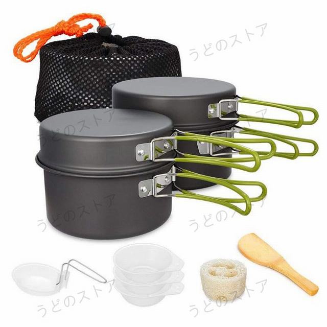 【製品の説明と仕様】材料:鍋セット本体/超軽い酸化アルミニウム ハンドル/アンゼン食品級のシリコンとステンレス重量:850g 使用人数:2〜3人(推薦)鍋L:16.3cm x 9.2cm ( 1.92L ) フライパンL:16.5cm x 4.7cm ( 1L )鍋M:14cm x 8cm ( 1.23L ) フライパンM:14.3cm x 4.1cm ( 0.66L )付属品:PP材お碗お碗x3 竹しゃもじx1 スポンジx1 スプーン×1 収納袋 ×1 【滑り止め 防熱設計】 防熱する為、プラスチック材で作って蓋とハンドルカバーは、偶発的なやけどを防がられます、鍋を加熱した状態でも、お気軽にご利用ください!【折りたたみできるハンドル 持ち運びが簡単】 ハンドルは折りたたみ時、10点のセットは一体に収納できます。收納バッグに入れて、非常に小さいサイズので、持ち運びがとても便利です。【高強度 高耐久】 ハードアノダイズド加工された鍋は表面硬度が高いので、耐摩耗性が高く、表面の傷や腐食等を避けることで永く使用できます。