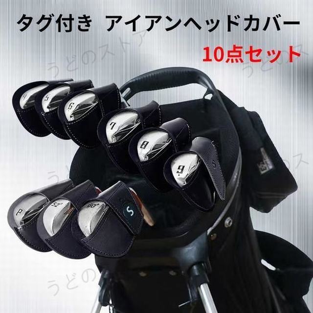 ゴルフアイアンカバー ヘッドカバー ゴルフカバー アイアンヘッドカバー タグ付き シンプル マジックテープ式 ネイビー 10点セット PU革 高級感