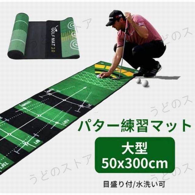 サイズ:50*300 cm マット素材(表面):ナイロン マット素材(裏面):TPR 【表面効果】 ゴルフポピュラーなグリーンを再現したました。初心者から上級者まで扱いやすいパターマットです【柔軟性は抜群】 厚い材質を採用し、質感は柔らかく、マンションや二回の部屋でも安心の防音仕様です。フローリングに設置してもボールの転がる音や床の振動などを感じることもありません【滑り止め、目盛り付き】 下部分は耐摩耗性に優れた熱可塑性ゴムで作られており、滑り止め、耐摩擦性は抜群です。長さ3メートル、目盛りもついており、距離感をつかむ練習に最適なゴルフパターマットです【便利さ】 室外?室外を問わず、どこでも練習ができます。また、使用しないときはくるくる巻いて収納できます。持ち込みにも便利です【洗濯可】 マット汚れの心配はなく、掃除機で掃除したり、洗濯機で水洗いしたりできます
