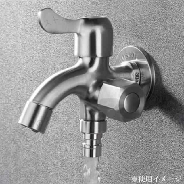 サイズ:掲載写真をご参照ください。洗濯機や花壇、畑の散水用などに便利な2口横水栓です。2口の蛇口、横水栓です。庭、ベランダなどあらゆるところに設置してとても便利に使えます。※キッチンなどの飲料水用蛇口としは使用は出来ません。SUS304のステンレス製なので、耐食性や強度が優れていて、屋外でもでも問題なくご使用いただけます。