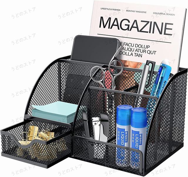 収納力抜群:様々なアイテムの収納に便利な7つのスペースに、引き出しも付いています。シンプルな黒色でインテリアにもマッチしやすく、幅や深さの異なるスペースで小物もすっきりと収納することができます。背部にはメモや書類?電卓などが立てられるようになっています。スチール製:黒い網状のデスクオーガナイザーは中身が見やすく、どこに何が入っているかを分かりやすいです。また、スチールは非常に丈夫で、表面の粉体塗装が耐久性に優れ、錆びにくいので、いつまでも美しい状態を保ちながら使えます。スチールのしっかりとした重みで安定感があり、重みのある物の収納もできます。ゴム足付き&他の使い道:下には滑り止めが付いているのでデスクに傷が付く心配もなく、ガタツキもなく安定して置けます。デスクオーガナイザーではなく、リモコンスタンドとしてもおすすめです。お手入れ簡単:汚れてしまったしても染み込んだりすることがないので、拭き掃除がしやすく、きれいを保つことができます。ホコリが溜まってもブラシで簡単に掃除できて、お手入れが簡単です。