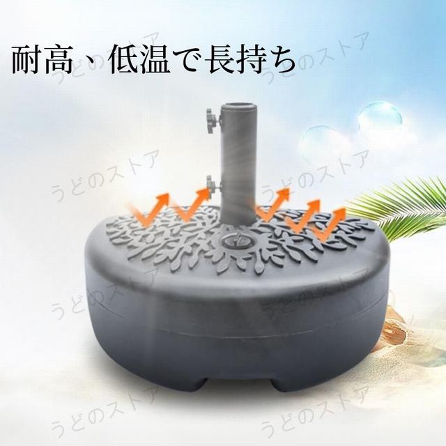【商品内容】パラソルベース(スタンド)×1個【対応パラソル】:(約)直径38mm/48mm 【材質】:ポリエチレン 他【提供重量】:約20kg【サイズ】51*31*18CM【商品仕様】サイズ(約):【半円形】:壁掛け式で場所を取らず、他のガーデンパラソルベースの欠点を補うことができ、壁沿いの使いたい場所にピッタリです。使用後は中の水を抜けば軽くなるので持ち運びにも便利です。本体は取っ手付きなので持ち運びがラクラクです。一人で簡単に操作できます。