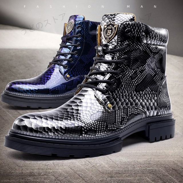 ブーツ メンズブーツ シューズ マウンテンブーツ レザー 蛇柄 レースアップ エナメル バイクブーツ 滑り止め