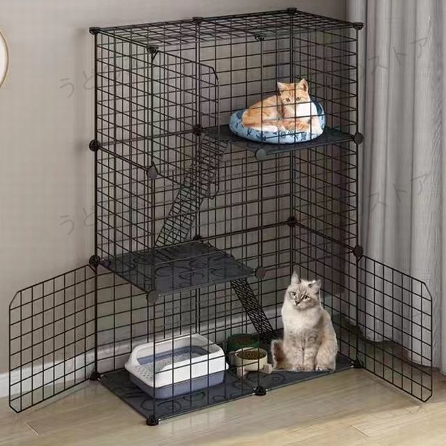 サイズ:掲載写真をご参照ください。ジョイント式ペットゲージコネクターでパーツを繋げるだけなので、1段〜3段、ゲートの位置など自由に組み立てることができます。簡単に分解することができ、軽量だからゲージの片づけや場所の移動がとっても楽です。DIYでケージを作ることができ、追加の工具なしで自由に組み立てることができるので、自分のアイデアや自宅の様々なシーンやサイズに合わせて、満足のいく猫城を作ることができます。また、猫の大きさに合わせて、状況に応じて一段?二段のタイプを組み立てることができます。海外製インポート品なので,取扱説明書はありませんが組み立てはカンタンにできると思います。
