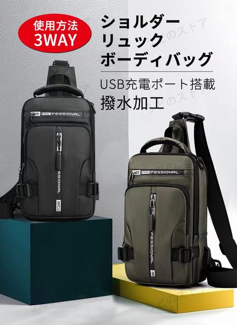 ボディバッグ メンズ USB充電ポート 3way ショルダー リュック 撥水加工 斜め掛けバッグ 仕分け 収納力抜群 左右交換 蒸れにくい