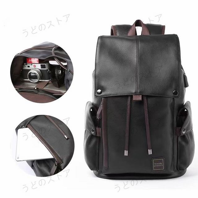 【優れた防水性能】表面はpuの生地で、雨で濡れてもカバンの中の荷物を濡らすことなく持ち運びが出来ます。汚れにも強いのでお手入れも楽に行えます。【大容量/多収納】メイン収納スペース×1、PC収納スペース×1、ポケット×2、フロントポケット×1、サイドポケット×215.6インチまでのノートPCやA4サイズのファイル、書類を収納可能。【利便性】側面にはボタン式のポケットが付いており、小物の収納やペットボトルを入れたり出来ます。背面はメッシュ加工が施されているので、通気性が良く、夏でも快適に持ち運び出来ます。シンプルながら、他のバッグとは違うお洒落なデザインのバックパック。カジュアルで使用するのはもちろん、ビジネスバッグとしてもご使用頂けます。