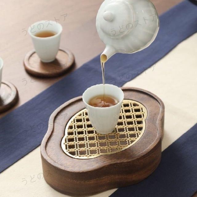 材質:ウォルナット名前の通り茶壺を置く茶道具が壺承です。簡単に言ってしまえば、水がこぼれたときにそれを受ける皿で、お茶を淹れる際に多く用いられる茶道具です。干泡法では茶盤のように湯を茶壺にかけたりはせず、壺承は多少のこぼれをうけたり、優雅な雰囲気作りのために使われます。材質は軟らかい光沢のウォルナットで茶壺に馴染みます。