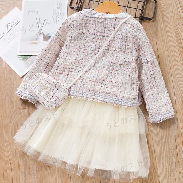 ツイードのノーカラージャケットとチュールが可愛いワンピース、お揃いポシェットの豪華3点セットですサイズ参照(多少誤差がございます):?100cmジャケット着丈 約34cm身幅 約31cm袖丈 約30cmワンピース着丈 約58cm身幅 約30cm?110cmジャケット着丈 約35cm身幅 約32cm袖丈 約37cmワンピース着丈 約60cm身幅 約32cm120cmジャケット着丈 約38cm身幅 約34cm袖丈 約40cmワンピース着丈 約62cm身幅 約32cm?130cmジャケット着丈 約39cm身幅 約36cm袖丈 約41cmワンピース着丈 約65cm身幅 約34cm海外インポート品の為、縫製が甘かったり,糸くず、畳ジワがある場合がございますので。ご理解の上,ご購入ください。
