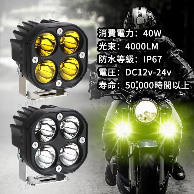 オートバイ、4WD、SUV、オフロード車、船舶、重機、農作業、トラクター、コンバイン、フォークリフト、路肩灯やバイク用フォグランプ等夕暮れ時、倉庫作業、夜間作業に便利です。商品詳細照射角:スポット色温度:6000?6500k消費電力:40W光束:4000LMx2防水等級:IP67電圧:DC12v-24v作業温度:-40°C?80°C寿命:50,000時間以上レンズ部材質:PCボディ部材質:アルミ合金(ダイキャスト)取り付け金具:ステンレス鋼セット内容:取付金具 本体2個取付ステーで上下のライト角度、アングル調整可能です。バッテリーのプラスとマイナスの接続だけですぐに使用可能です。照明角度によって180度程の調整ができます。高輝度チップは消費電力が少なく通常のLEDライトより相当明るいです。優れた放熱性 長寿命 酸化防止処理された6063アルミを採用非常に優れた耐熱性?放熱性を実現ライトの発熱を素早く発散させ寿命を延ばします。防水防塵?耐衝撃IP67の防塵防水保護等級仕様により海やキャンプ、雨にも大丈夫です。フォグランプとしてだけではなく、投光器、ワークライトとしても活躍してくれます。