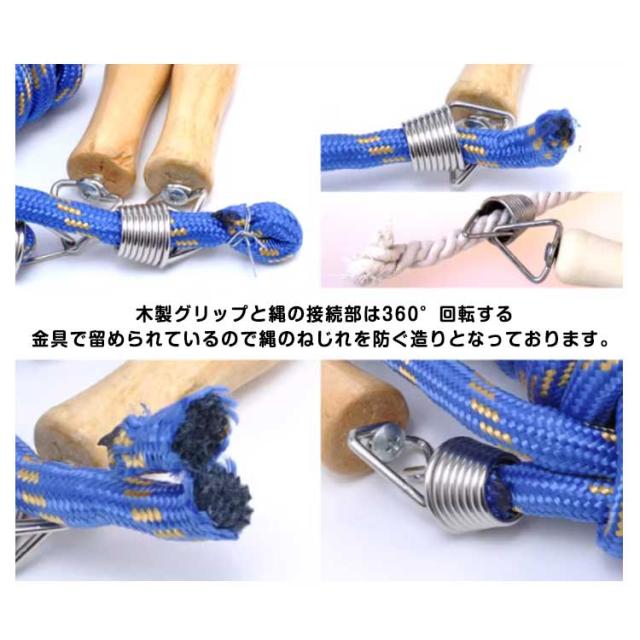 | 3m/5m/7m/10m!体育や運動会、学級活動、イベントなどで大人数で楽しめる大縄跳び用ロープです。 グリップは木製なので手になじみやすく、痛くなりにくい設計となっています。 木製グリップと縄の接続部は360°回転する金具で留められているので縄のねじれを防ぐ造りとなっております。 | |