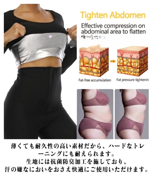 | 着るだけでダイエット!超軽量素材採用、着心地が抜群。 ●裏地は気密性の高いポリウレタンコーティングを採用し熱を逃さず,軽い運動でも大量発汗で通常の運動以上のシェイプUP、脂肪燃焼、減量効果が期待できます。 ストレッチ性が抜群、身体の動きを妨げず、どんな運動をしても体にピッタリフィットし着心地が良い!美しい引き締めボディを作り上げます。 ●薄くても耐久性の高い素材だから、ハードなトレーニングにも耐えられます。生地には抗菌防臭加工を施しており、汗の嫌なにおいをおさえ快適にご使用いただけます。 ●超軽量で、ジョギング、ウォーキング、ヨガ、ホットヨガ、ジム、エアロビ、エアロバイク、サイクリング、ダンス、テニス、家事、お買い物、お散歩など様々なシーンで活躍できます。 | |