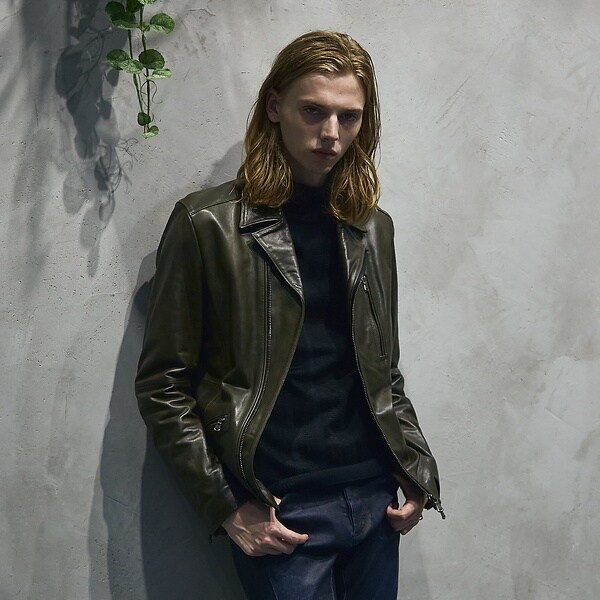 フロントデザインの顔となる、斜めに走らせたシングル、ダブル両方の良さを併せ持つセミダブルレザージャケット。装飾を極力排除し、ミニマムな表情に仕上げた洗練されたデザイン。実用性にも拘ったダブルジッパーは米国IDEALジッパーを使用するなどディティールにもこだわった本格派の一着。