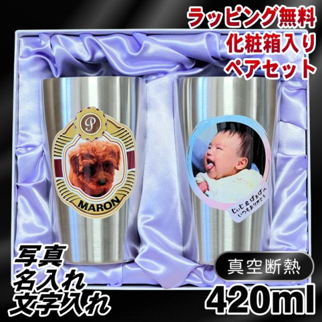 【化粧箱入り】 写真入り タンブラー ペア 名入れ プレゼント 真空断熱 保温 保冷 ステンレス 名前入り ペット うちの子 写真 オリジナル グッズ 犬 猫 ペットオリジナルグッズ プリント 印刷 グラス コップ おしゃれ ビールグラス バースデー ギフト 420 ml セット PSYN-102