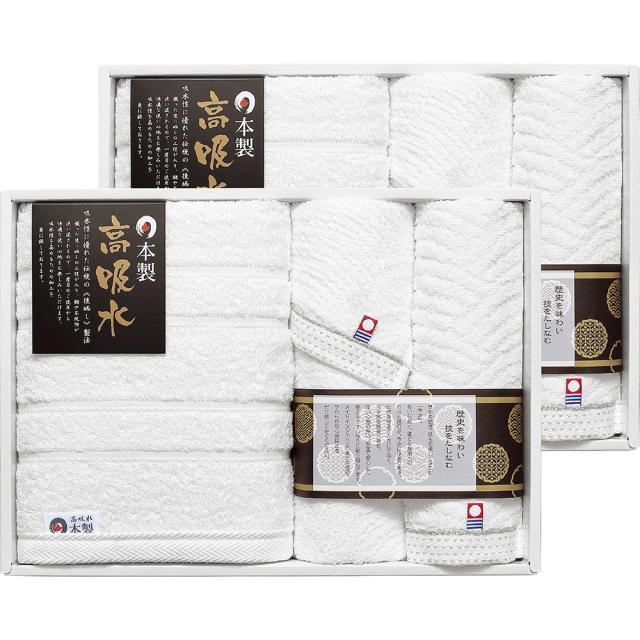 日本のタオル「2大名産地」のタオルギフト高吸水加工を施した「泉州タオル」と心地良い純白の「今治タオル」それぞれの良さをお楽しみ下さい。二段重ね