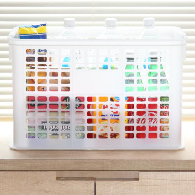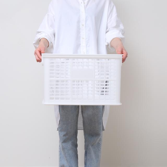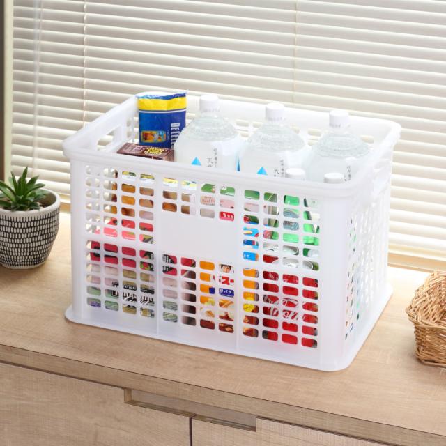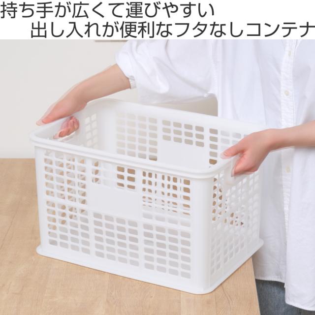 たっぷり収納できて持ち運びしやすいコンテナです。フタなしなので、頻繁に出し入れする物の収納に便利です。