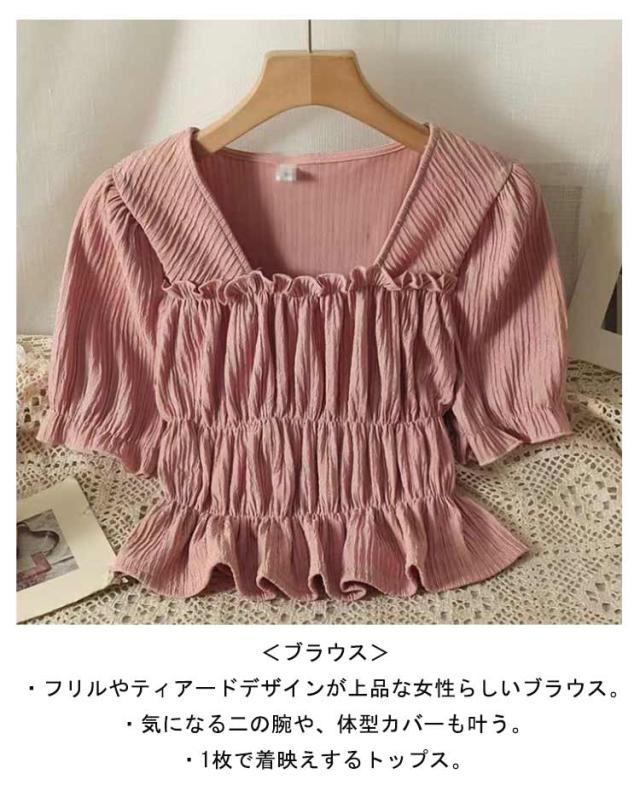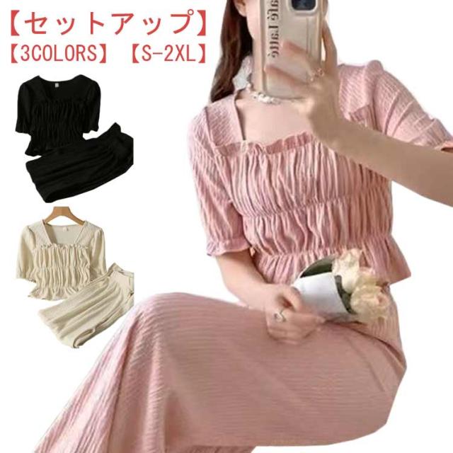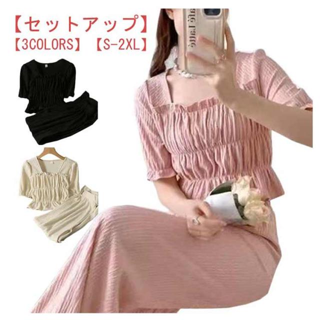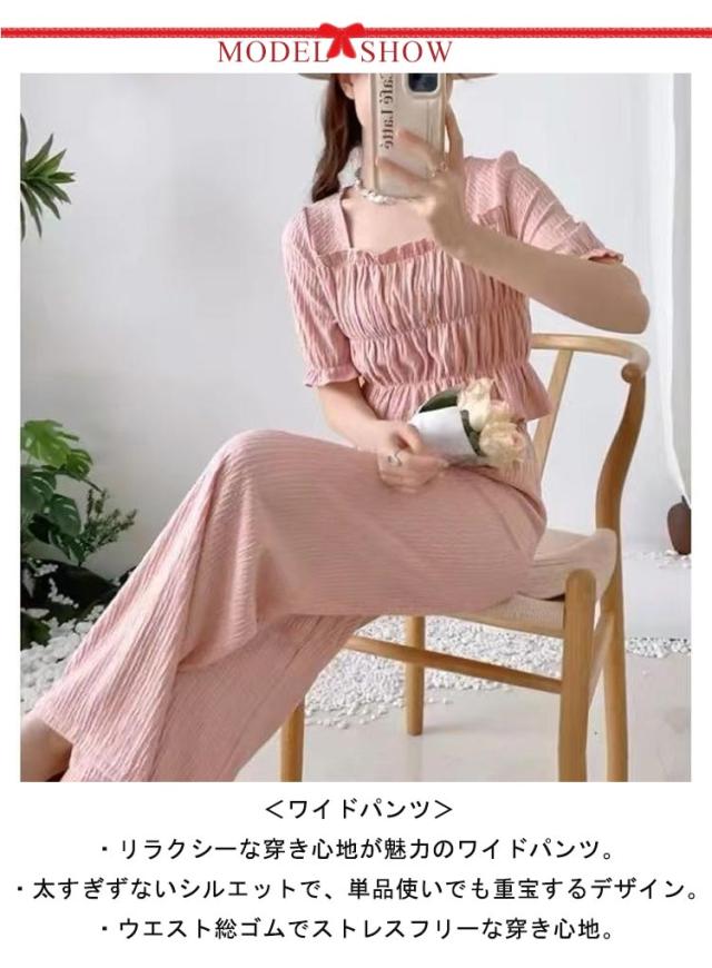 ティアード レディース フェミニン きれいめ セットアップ 上下セット 大きいサイズ セットアップ ブラウス カジュアル 夏 ワイドパンツ 涼しい 体型カバー ウエストゴム 半袖 オフィス 通勤 トップス ロングパンツ ボトムス
