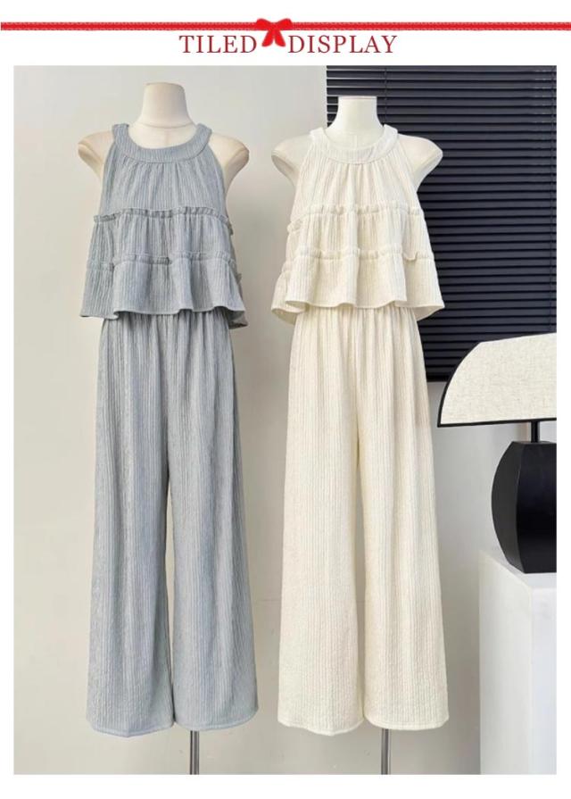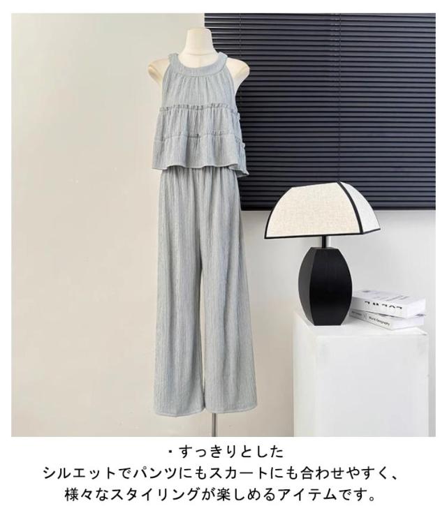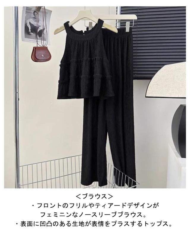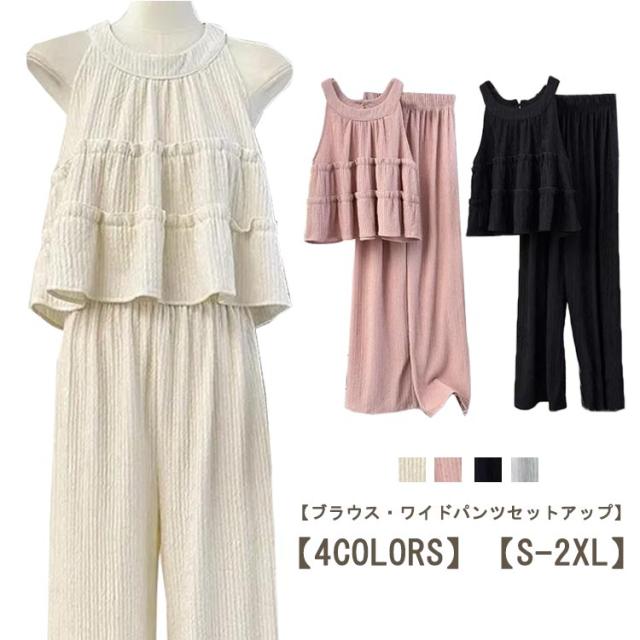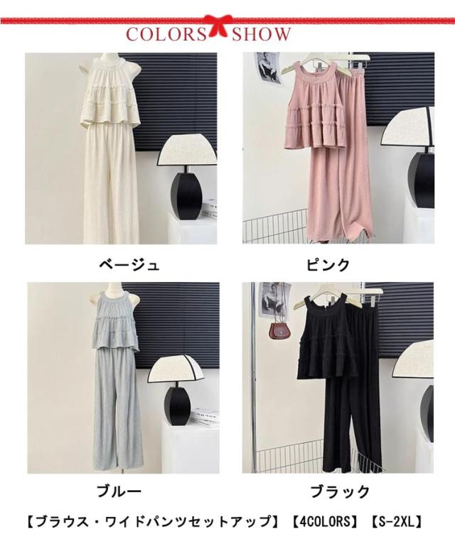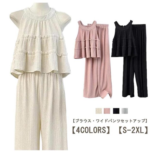 | 【ブラウス・ワイドパンツセットアップ】【4colors】【S-2XL】 <ブラウス> ・フロントのフリルやティアードデザインがフェミニンなノースリーブブラウス。 ・表面に凹凸のある生地が表情をプラスするトップス。 ・すっきりとしたシルエットでパンツにもスカートにも合わせやすく、様々なスタイリングが楽しめるアイテムです。 <ワイドパンツ> ・リラクシーな穿き心地が魅力のワイドパンツ。 ・太すぎずないシルエットで、単品使いでも重宝するデザイン。 ・ウエストゴムでラクな着心地。 | |